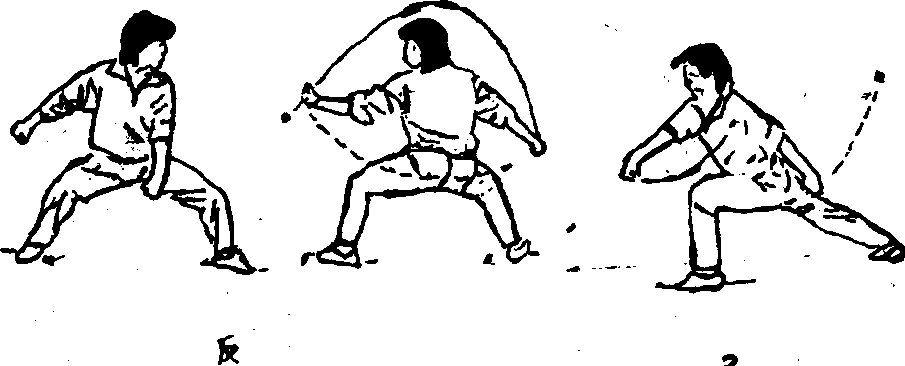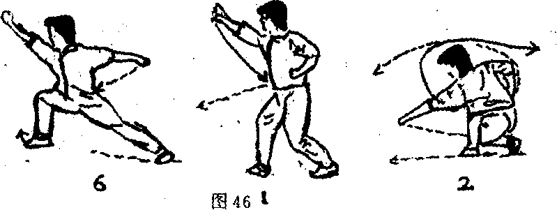 .3&右拳随身体饿右转经上向下抡挂,左拳自然后摆;目随右 拳。面*5②) a