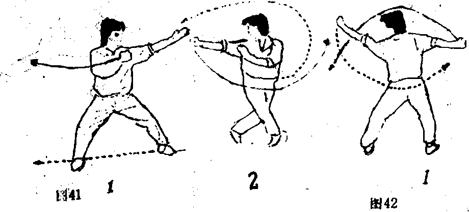 (1) 身体左后转:左掌变拳随体转经上向左挂出,右摹随体转 经下向右摆动。(图42①)