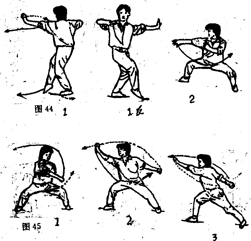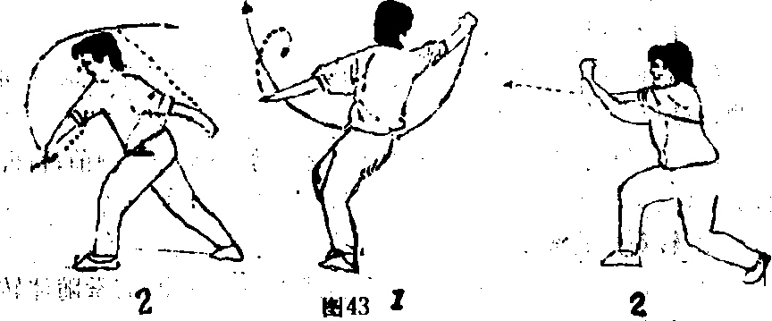 后抡摆,左拳变掌经上向前下划弧;头向石转,目随右拳。(图43 .①)