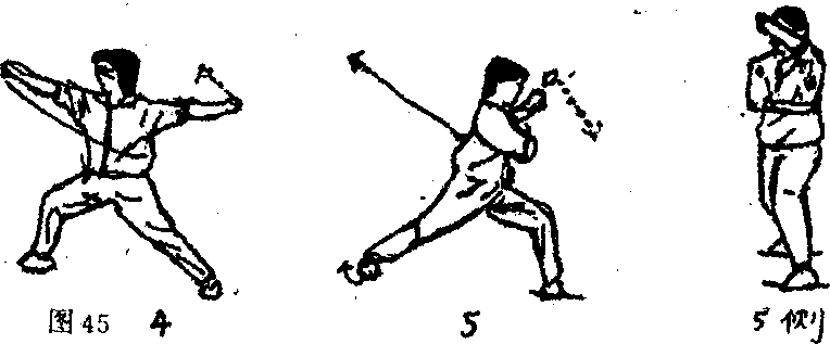 (5) 身体继续左转,右臂屈肘继续向左横扫,右拳收于左腋下, 左臂内旋上架;目随右拳。(图45⑤及侧面图)