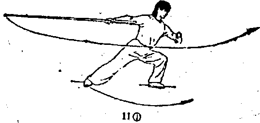 (1)重心左移 成左弓步;同时,左掌向左侧平摆。(图11①)