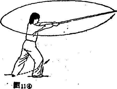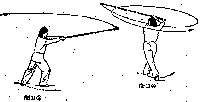 (3) 身体左转,左脚向右后方插步;同时双手持棍向左平抡。 (图11③)