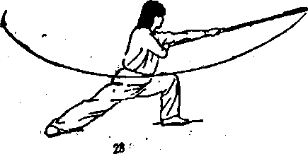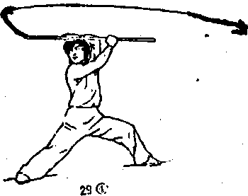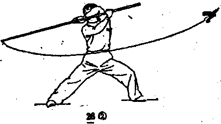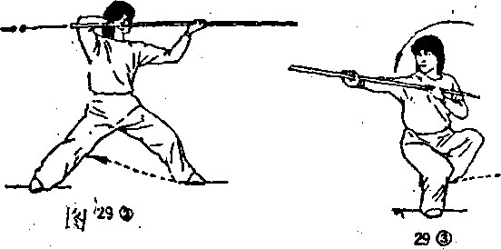 (1) 双手持棍上举。(图28①)(2) 双手持棍拧转,使棍梢经后、向右云拨。(图28②)(3)身体左转成左弓步;同时,双手持棍随体转向左云拨,棍把至于 左腋下,目视棍梢。(图28 3)29、扣 IHMB(1)身体稍右转;同时,双手持棍经前向右云拨:目视右侧。(图29①)(2) 重心移至两脚之间,身体右转,同时;双手持棍经后向左云亦 拨'目视棍梢。(图29②)(3) 重心右移,右脚屈膝半蹲,左脚扣于右膝窝;同时,双手持棍向右戳把HI视棍把。(图29庄))