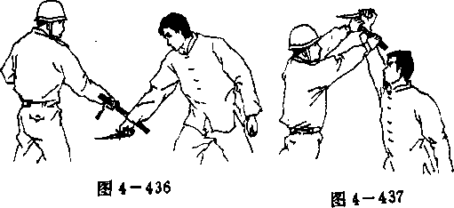 当暴徒用匕首剌我档部、腿部时,我立即向后撤步,并 用警棍田里向外格压暴徒右手腕(图4 — 436),而后进行攻 击。