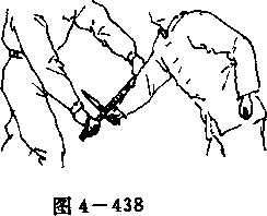 当暴徒用匕首上刺我头部、肩部时,我双手持警棍两端, 用警棍中部向上托架住暴徒右手腕(图4-437),而后起脚弹 踢最徒裆部。