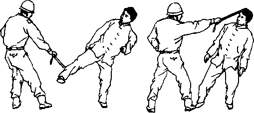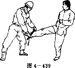 当暴徒起右腿侧蹬我膝关节时,我立即向后撤步,右手 用警棍由里向外格挡暴徒右小腿(图4-440),而后右手用警 棍抡盖暴徒头部(图4 — 441)。