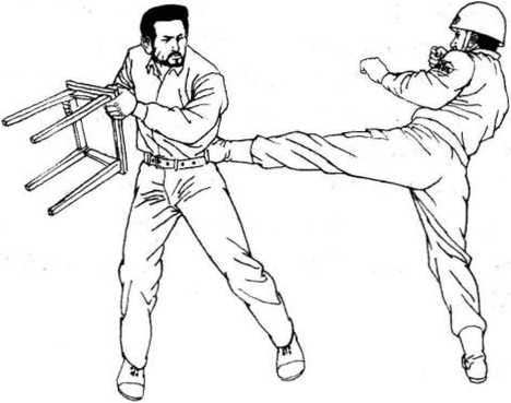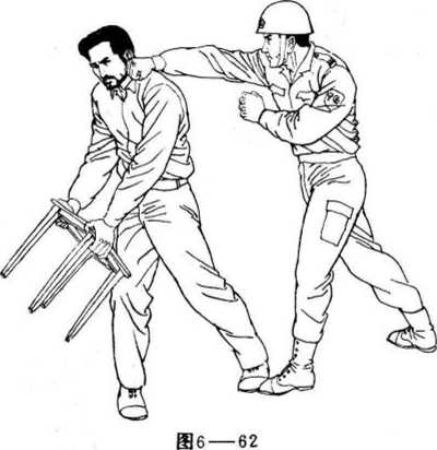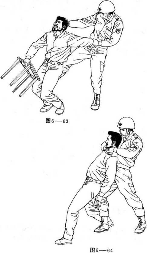 对付持椅的歹徒,警察可以贴上去,和歹徒胶织在一起, 使其手中的椅成为束缚双手的绳索,也可以如图6—61,所示, 当歹徒挥椅欲发起攻击时,先发制人,起左脚踹击歹徒。