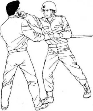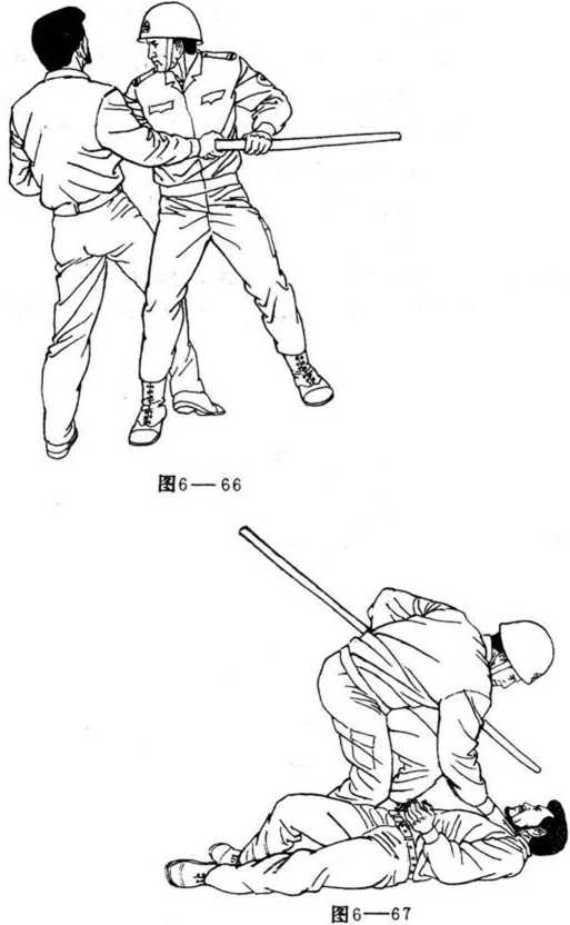 棍的技击特点是放长击远。所以,碰到持棍的歹徒,警察 务必要想办法靠上去,一旦靠近歹徒,便已掌握了擒敌的主动 权。