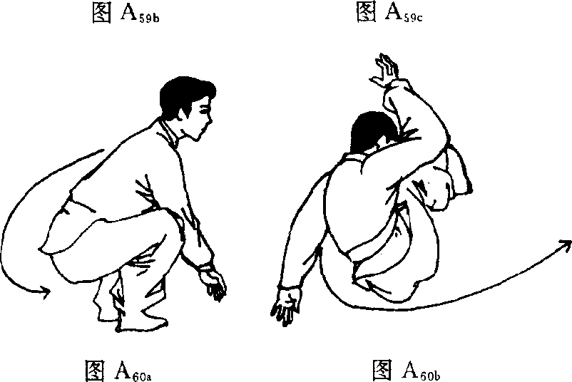 1. 预备式:背向前方蹲立,两臂下垂。2. 动作要领:两肩后倒,身体团紧向后滚动,臀部翻起。 此时右掌在肩前撑地,头向右侧倾斜,左臂侧伸,经左臂、右 肩着地向后滚翻,然后两脚落地起身,如图A6g—狭3. 动作要求:团身要紧,动作要圆滑。