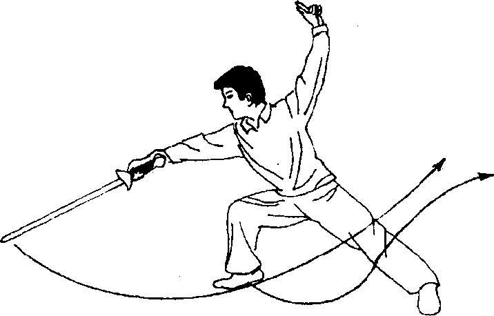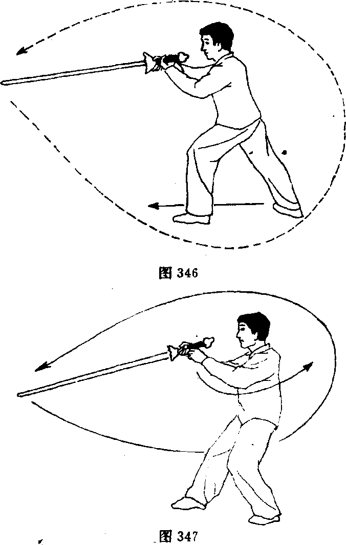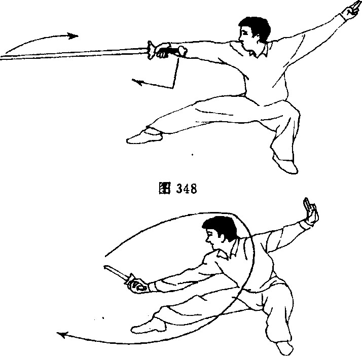随即使剑锋旋拨斜刺,左手措诀至头顶。目视剑尖(图 348)。提右步上步,右手持剑由下向上撩挑向巽宫方位。再落 右足蹬左足,右手持剑随步由上往下返回,、进左步剑随向艮 宫方撩挑,再连环向震宫方向撩挑。目视前方(图349).再使右手剑向右上方斜剌,开步托剑右旋转走,左手指 诀至头顶左上方。目视圈心(图350).
