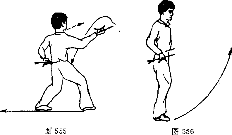 接上势,退右步,同时右手钺向内划 弧至右胯傍。左手钺划至左前方,眼看左手钺(图555)。接上 势,退左步,同时左手钺由上向右再向下划弧至左胯傍成并 步,右手钺不动(图556)。