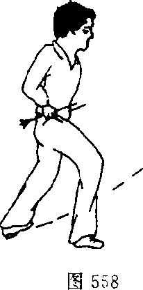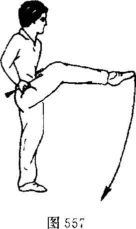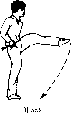 接上势,右脚下落(图558)。接上势,左脚提起,脚面要 平,向前踢出,右腿微屈(图559)。接上势,左脚落下,双钺不 动(图560)。