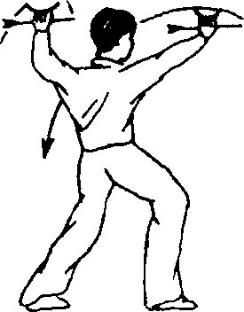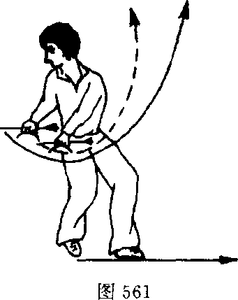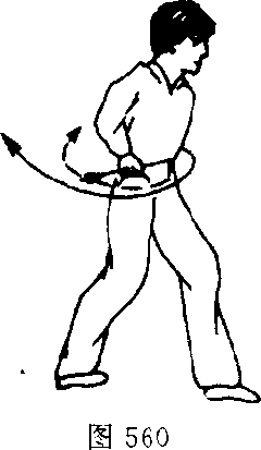 15.右追风赶月 接上势,腰胯向右转,同时两钺随之转 动,右钺至右胯后,左钺摆至右胯前,左手心朝上,右手心朝 下。目视右手钺(图561)。接上势,两手再下翻,由后再向前, 左手在前,手心向内,右手在后手心向外,随之上右步,两钺向 上豁,至头上方,右手在头前左手在头后O