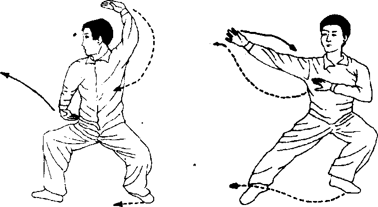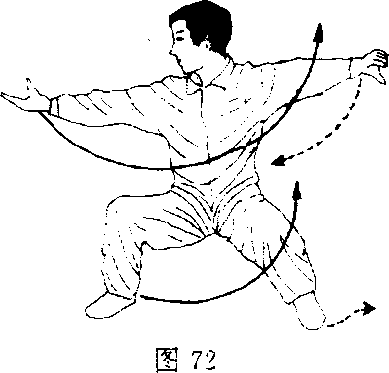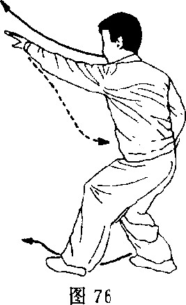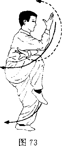 换式:右臂随身体向右游移的同时,画弧线上挑,而后 向后画弧下按,左掌随之,双手同时摇环。目视前方(图 74),