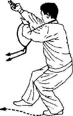 换式:摆右步,扣左步,同时掌心向上双手向对方气海 用力戳点。目视圈心(图77)。