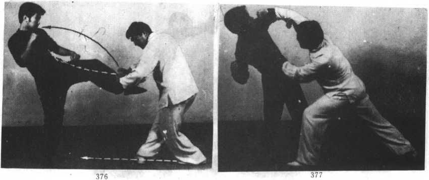 (1)敌以左腿弹踢我档部,我速收腹,同时以双手(虎爪)用力挂压敌之足背部,使敌进攻失 效。上动不停,左脚随势向前迈出一大步,右腿蹬直成左弓步,上体前倾,双手同时变拳,由腹前向 前侧身冲出,右拳击敌之面部,左拳击敌之腹腔(图4-6-376—377)。