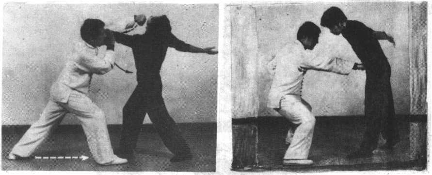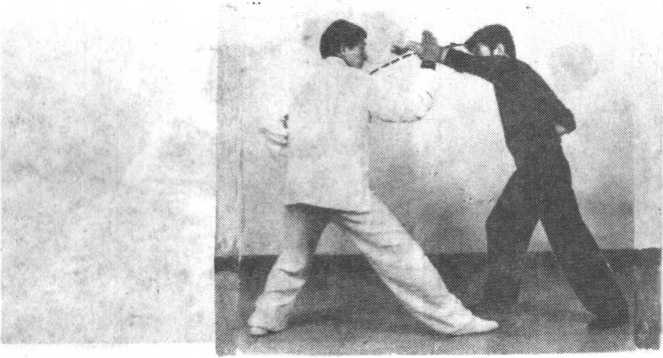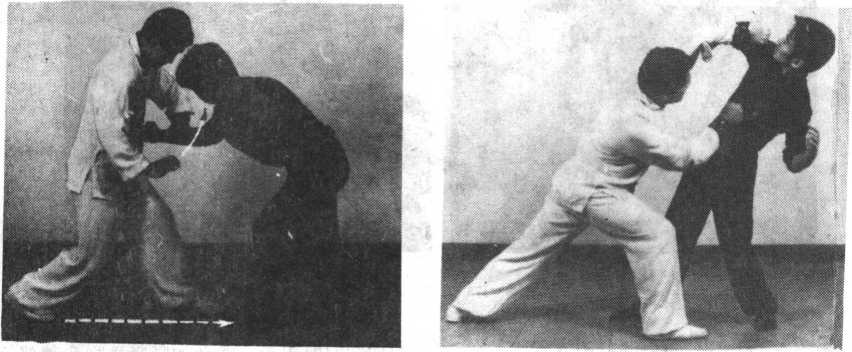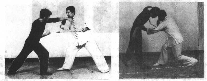 (2)敌右拳击我腹腔,我速近身,双手虎爪用力下压。上动不停,右脚向前上一大步,屈膝半 蹲,左腿挺直成弓步,随势左右两拳侧身向体前成弧形冲出,力达拳面,分别击敌面和腹部(图4-