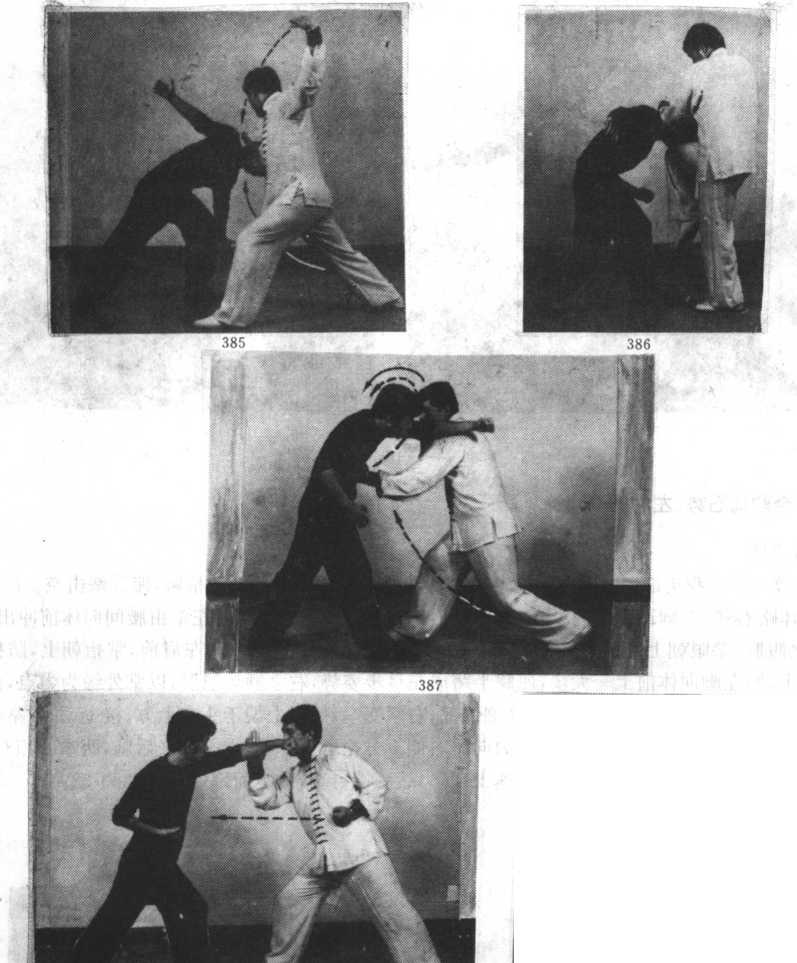 (1)敌左拳击我头部,我速右弓步侧身闪躲,屈肘以右掌向内拍击敌拳腕,使敌拳击空。上动 不停,身体略右转,左脚迅速跟进半步,脚后跟抬起,成左跟步姿势。同时左拳由腰间向体前冲出, 猛击敌之腹腔,拳眼朝上,力达拳面,肘部略屈,腕部挺直,左掌随势收于左肩前,掌指朝上,防护 下颁。接上动,左脚向体前上一大步,屈膝半蹲成左弓步姿势,右掌顺势屈肘,以掌外缘为力点,由 左肩前向前,向右成弧形归掌,猛击敌之侧颈部,右拳变掌,屈肘上架于头左上方。接上动,右掌变 着拳,顺势按敌头部,左掌同时变拳,猛力向体右侧下方抡劈劈下砸,重击敌之后脑,两拳心相对, 拳眼朝上,力达拳轮。随势右腿提膝迅速上顶,力达膝端,撞击敌之面部(图4-6-383-389),