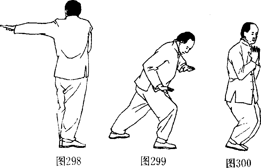 2. 双手复转于胸腹前,手心朝下,左手拇指和膻中穴相 平,右手拇指与肚脐相平(可略高于脐),但不得超过膻中,否 则易憋气。也不可低于脐,否则易伤气)。同时左脚向左后方 撤一大步,右腿屈膝,成右弓箭步,重心在右腿。两眼顺右食指 尖内侧往下注视,意欲入地三尺。歌曰广按劲凭栏楼下瞧「'即 凭栏下望之意。(图299)
