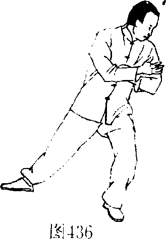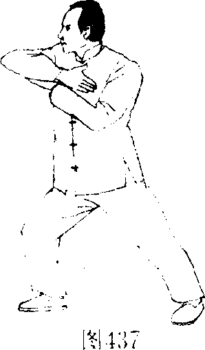 眼神回看左肩井,右脚向左前挪移半步,然后目视正面弓 步顶肘。(图436.437)