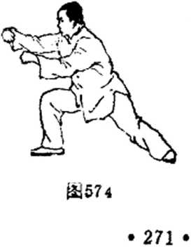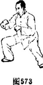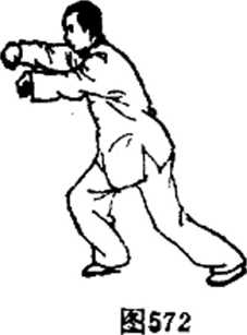 前下,再变双逆缠腕内旋上翻经腹靛向胸前击山,双臂屈肘 下坠,拳心斜线相对,右拳在前,左拳略后,间距约10厘 米。眼看双拳,耳听身内。(图572、573、574 )