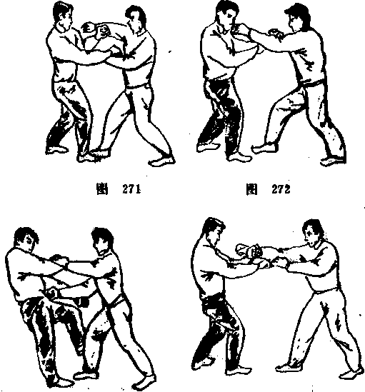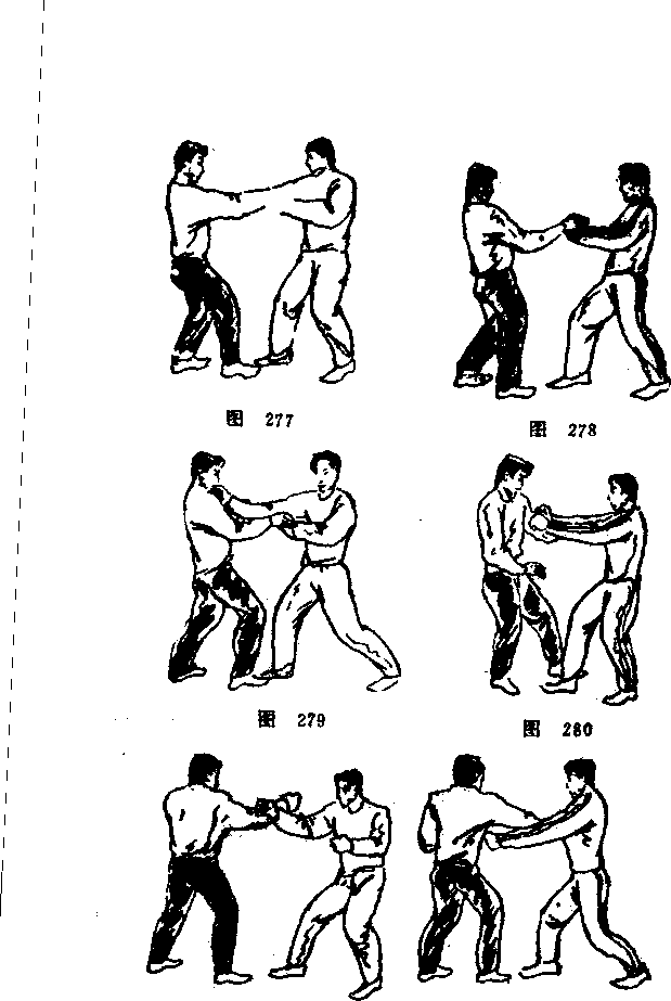 亲例一、当对方抓住我臂时,我可用大成拳中 二争力或惊抖劲使其身体受到震动,促其松手,待 敌重心不糖之际,我迅速以右手钻拳打击其下颌, 趁其后仰之际,我谦步上前,踏其中线,触其胸部, 向前骤城舞力,将其放倒(图277、278,279,280 )。