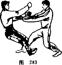 示南圭,对方以看直拳击来时,我遵以左脚向 左前方近二大步,'同时我右手拳迎敌右曹,并以推 手中豹沾麟沾料之,然后向外转腕,拳心向上,以 力向前击其面部,我速睬步,以整体力向前爰放之 (图281、 282 ,283 )。