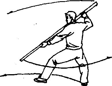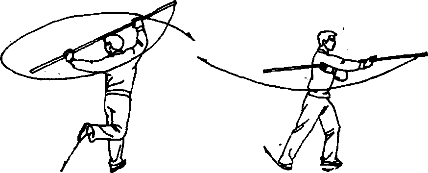 前向右、向前平绕,使棍身随着转体动作在头上平转一周半(图 64) o