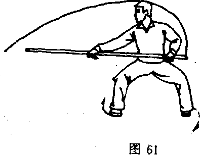 ②右脚向左脚前跨一大步,上体随即向左后转,两腿半蹲成 马步;同时,右手随着转体动作从右肩前上方一面滑握于棍身中 段,一面向前、向右作抡劈;此时,右臂向右伸平,手心向下, 虎口向左,左手虎口向右,把端高度在胸下腰上之间;目视棍把 (图 61)。_