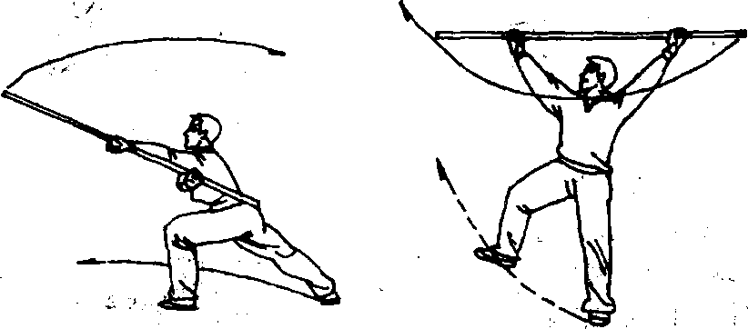 ①两腿立起,随即左脚向前上一步;同时两手将棍向上平
