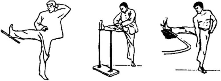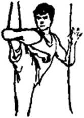 身体的柔韧性是充分发挥技击动作与威力必不可少的素质 之一。截拳道的招式中,腿法又特别用得多,这就尤其要求腰 腿和柔韧性要特别好,因此,对腰腿柔韧性的训练必不可少。为 了提高腿肌的柔韧性,可把脚放在栏杆或类似的物体上,如图 52、图53、图54。腿与地面保持水平,并根据自己腿部柔软性 程度来决定腿放置的高低。