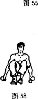 对于初学者来说,不要做强度很大的练习。把脚放好之后, 脚尖要正对身体方向,上体用力向前移动,如图52,使伸出去 的腿成直线。几分钟之后,换另一只脚,几天之内,当腿部肌 肉变得柔软而富有弹性时,就可以象图53那样,进行下一步, 即按压膝部,使腿保持直线。在不伤害肌肉的情况下,收甑使 身体尽堇向前倾斜。完成这个练习后,可以模仿图54,腿伸直, 手向下伸。在进行这个动作时,会发现身体开始向前倾斜,对 腿部的肌肉加强了压力。最后成图55那样,手能够摸到脚趾。 几个月之后,就完全能够像图56那样用手抱住脚,甚至可以把 脚下的支撑物升得更高些。