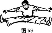 在上述这些训练能够很好地完成后,可开始做空中弹踢等 平衡训练。如图58,可以手拿两只轻哑铃在蹦床上高高跳起,增 强双腿的平衡能力和弹跳力。一旦在蹦床上能控制住身体,也 就能够如图59那样,做劈腿双飞脚,向前高踢腿(图60)及腾 空侧踢腿了(图51)。