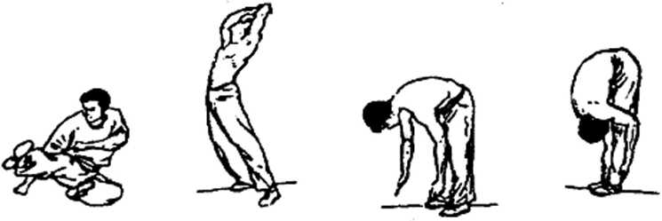 此外,还有一些包括身体伸展的柔软性练习,在增强了腿 部肌肉的弹性之后,应该尽量向后展体.然后再尽最向前屈体, 直到头部能够触到膝盖,如图62、图63、图64。