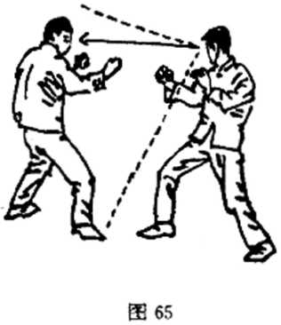 当你对付一个对手时,不仅两眼要盯住对方的眼睛,还应 将其整个身体都置于你的视野之中,如图65。