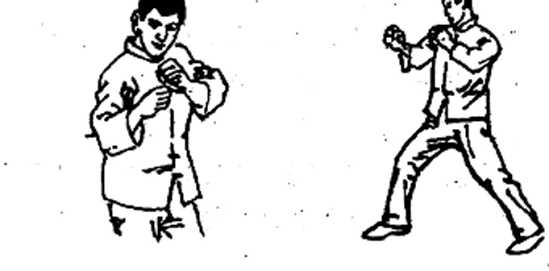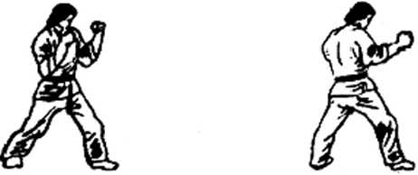 在图76中,可看到两位拳师的防御姿势都不正确。左边者 右脚跨出太大,身体暴露过多。右边者右脚与左脚相距太近,限 制了动作,并且容易失去平衡。