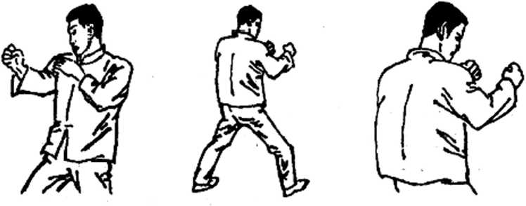 要经常对着镜子检查自己的姿势、手的位置和动作。看你 的姿势是否像一只猫站在那里,弓背、低颁、前肩稍微抬起,随 时准备扑跳。腹肌局部收缩、同时肘部保护侧翼,不要给对手 留有袭击的空隙。这种警戒式被认为是最安全的姿势。对于蹬 踢、击打和给身体提供足够的力量来说,也都是最有利的姿势。