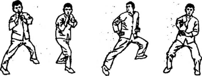 一只手在对方的内侧,另一只手在外侧,两皆前后做反时针旋转 运动,练习时向手臂施加压力,以迫使对方离开原来的位置。为 防止离开原来的位置,各自的膝部须稍微弯曲,并降低俄部位置 以保持身体重心的稳定,这种姿势能够获得两侧的良好平衡,但 不是前后的平衡。最后,李小龙是用一只脚向前来改变他的姿势 的,如图110和图111所示。通种姿势具有较好的全面平衡。虽 然这种姿势并不完全是截拳道的戒备式,但却与它比较相近。