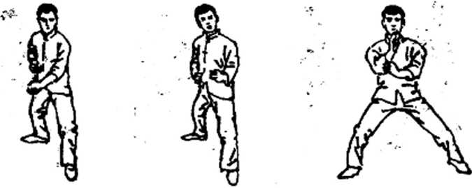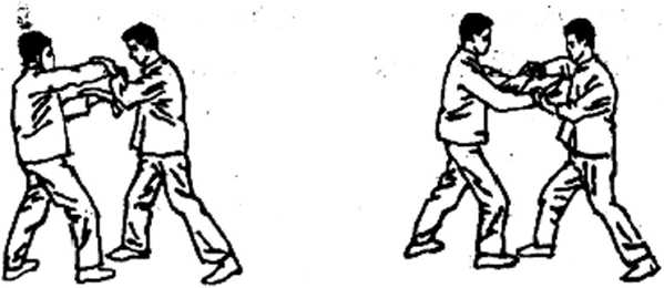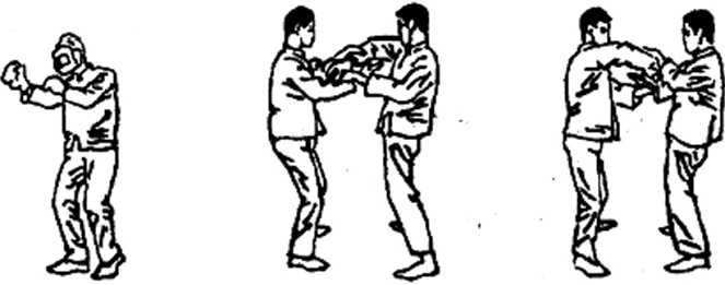两位练习者的两脚相互平行站立,如图108和图109所示。 双方的两手伸出直至双方两手的腕部互相接触在一起。各自的 71