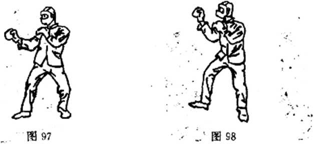 还有一个容易出现的毛病是,出拳时身体向前探出得太远, 如图98所示,这样的出拳案势笨拙而无效,因为在身体失去平 68