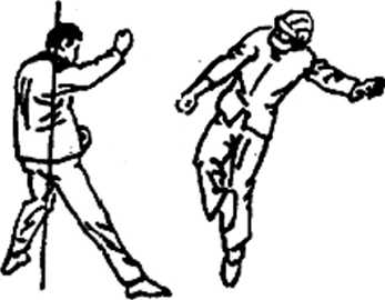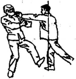 如果出拳时身体向后仰,如图97所示,则打击的拳绝对无 力,凡有力的拳,都必须是在身体直立、保持平衡及身体重心 向前腿移动的状态下击出的。如果身体不得不向后仰,那么也 必须在击发之前重新调整姿势。