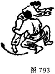 舍身技是将对手巧妙摔出的一种技术。它借助于对手向前 冲击的力量,不但化解了对手的攻势?同时 己方可用倒地技巧滚动拉扯,将对手摔倒, 它往往运用于解脱力量较大的对手的纠缠' 如图 809。