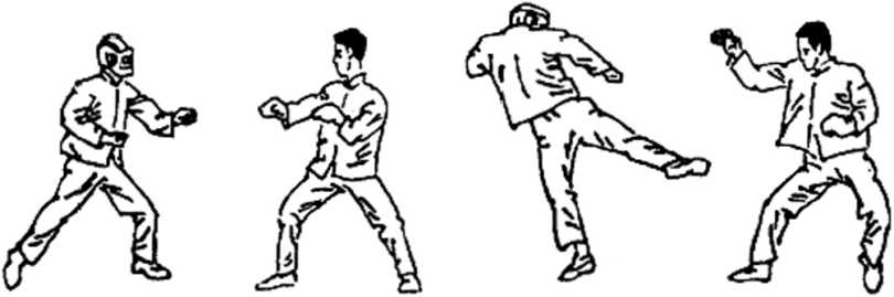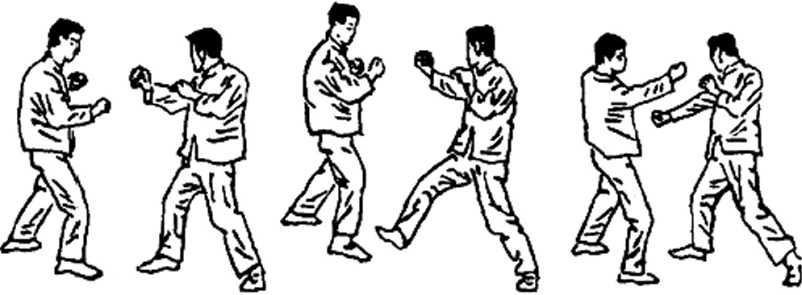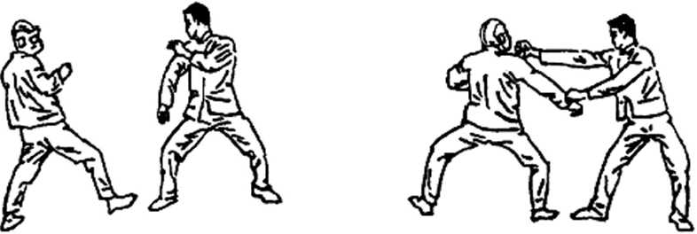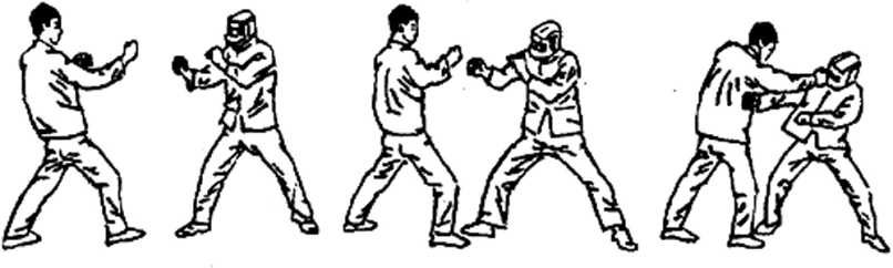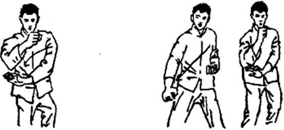 主要也是用来防守来自同一侧的攻击。其标准动作如图929。图 930是与传统的方法的比较。传统方法只有同侧格挡。没有这种 外侧低位相同的格挡方法。