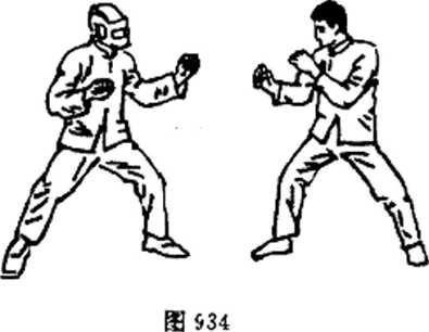 如图931,双方戒备式站立,对手以右直拳发起攻击,我以 外侧低位格挡将来拳压向右侧下方的同时,以右直拳攻击对手 面部,如图932、933。