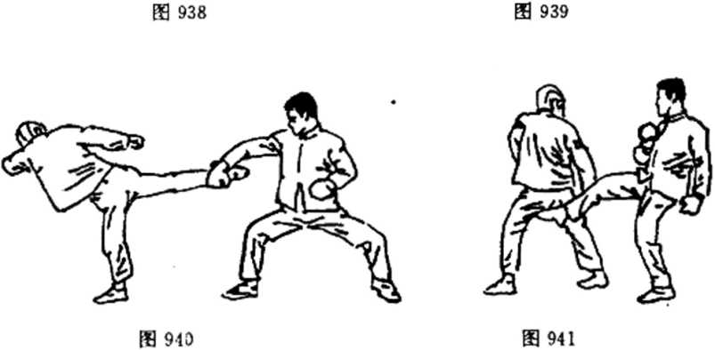如图938,双方戒备式,对手冲上来麻恐、 以前脚侧踢攻击我胸腹。我适当后移,并缪呷) 图936以前手内侧低位格挡向右外侧拍开脚踢,彳: 如图939、940/对手前脚落下时,我用前 ?93?