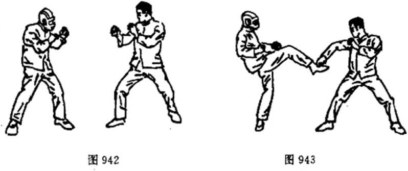 踢攻击其后裆部,如图941。如图942,双方持相反戒备式。对 手跨步上前用前踢攻击我裆部。我适当后退,并以外侧低位格 挡截击踢来的脚,如图943:对手脚落地后又以右直拳攻击我胸 腹,我以外侧低位格挡截击来拳的同时,以右直拳攻击对手头 部,如图944、945。