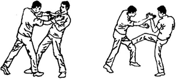 4手将我抱住并举起摔倒。我脚向后摆以借力用膝撞其裆 部。如图1101?1104。