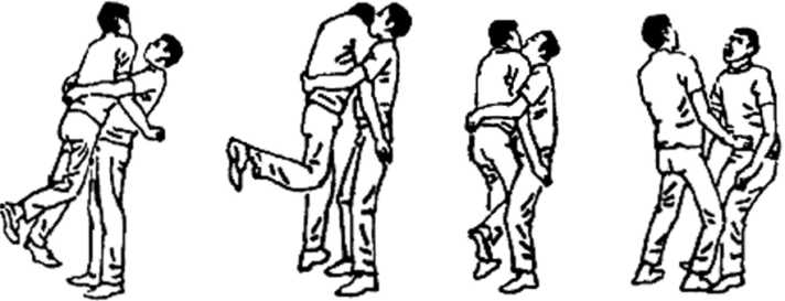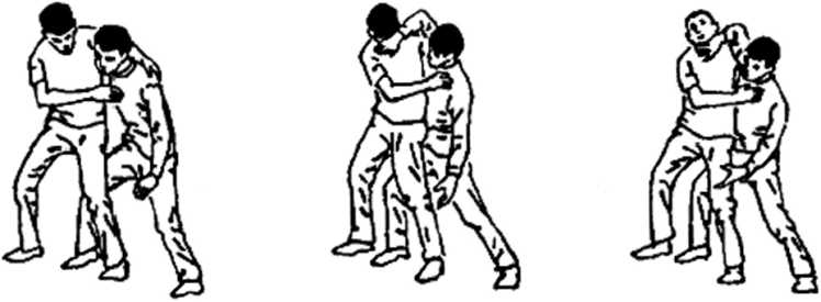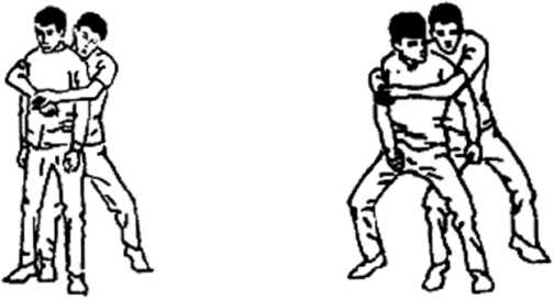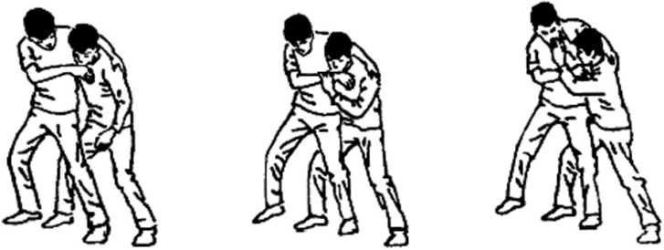 对手从我背后拦腰抱起欲摔倒,我用右手后摆击其档部。如