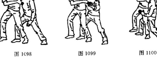 对手夹住我头部,我一手抓其臂,一手击其裆部,如图1098 ?1100。