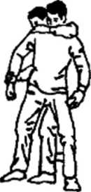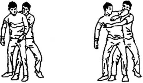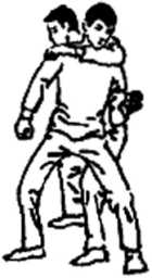 对手从背后抱住我,我身体右摆的同时,以左拳攻击对手 裆部,如图1107、1108o